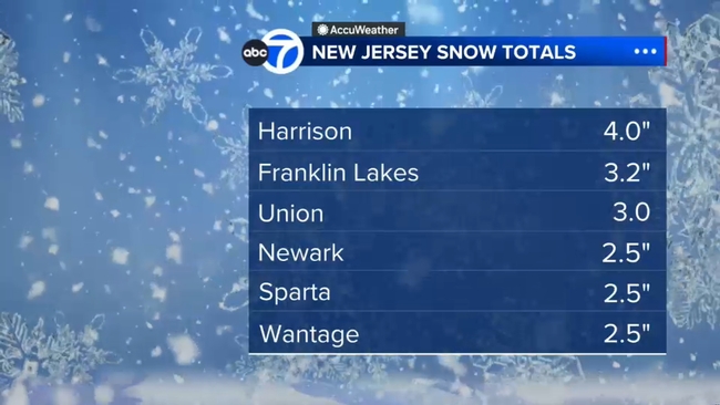 Higher totals were kept down in New Jersey due to ice; some areas of the Hudson Valley, Long Island, and Connecticut, however, saw more substantial snowfall.