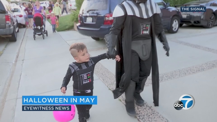 Neighborhood celebrates Halloween in May for boy battling rare disease