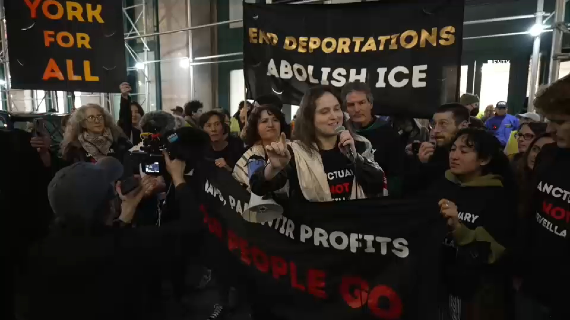 CHELSEA, Manhattan (WABC) -- Mayor Zohran Mamdani spoke to a crowd of anti-ICE demonstrators at Union Square on the sixth night of Passover for "Seder in the Streets" organized by Jews for Racial & Economic Justice, after which some activists headed to Palantir's Chelsea offices for a sit-in.