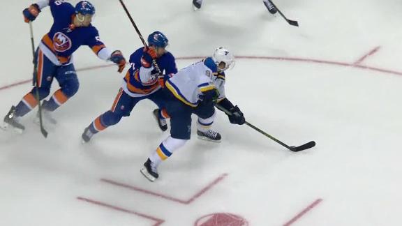 In the second, Blues defenseman Robert Bortuzzo was penalized four minutes for cross checking, an extra two minutes being assessed for pummeling Islanders forward Brock Nelson face down on the ice.