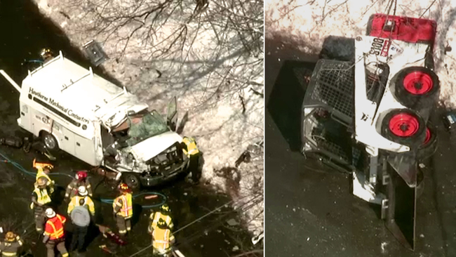 HAWTHORNE, New Jersey (WABC) -- Three people are hospitalized after a Bobcat snow removal machine plunged through a pedestrian overpass onto the roof of an oncoming truck in Passaic County.