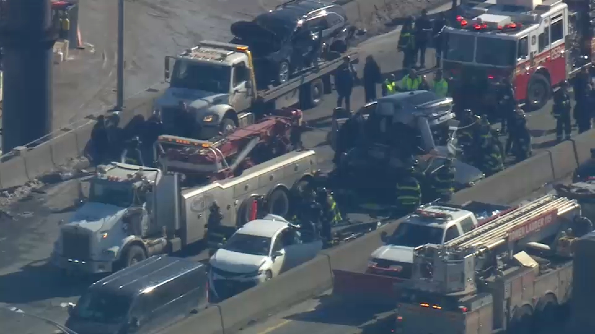 LONG ISLAND CITY, Queens (WABC) -- Nine cars crashed on the westbound Long Island Expressway in Queens, with some cars piled on top of others.