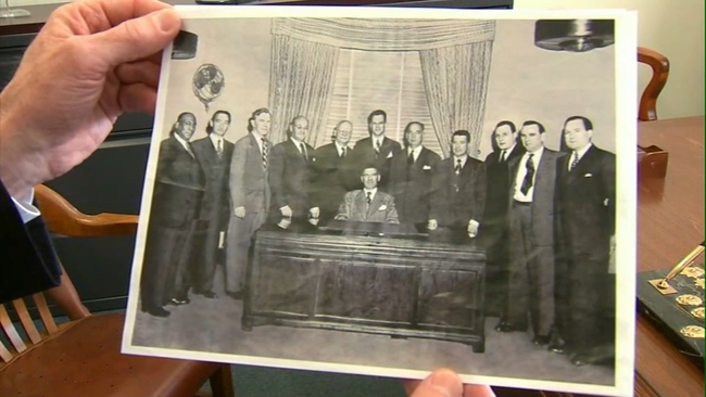 Looney is certain that his desk is the desk from a 1950 photograph of former Nassau County District Attorney Frank Gulotta sitting at an old desk.