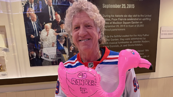 Asen's inflatable flamingo had "Go Rangers, 2022, ECF" and the date of Wednesday night's game written on it. Actually, it was one of two inflatable flamingos he had at the game. The other one was in honor of the Rangers goalie.