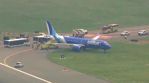 A JetBlue flight rolled into a grass area off the runway after landing at Boston Logan International Airport on Thursday, officials said.