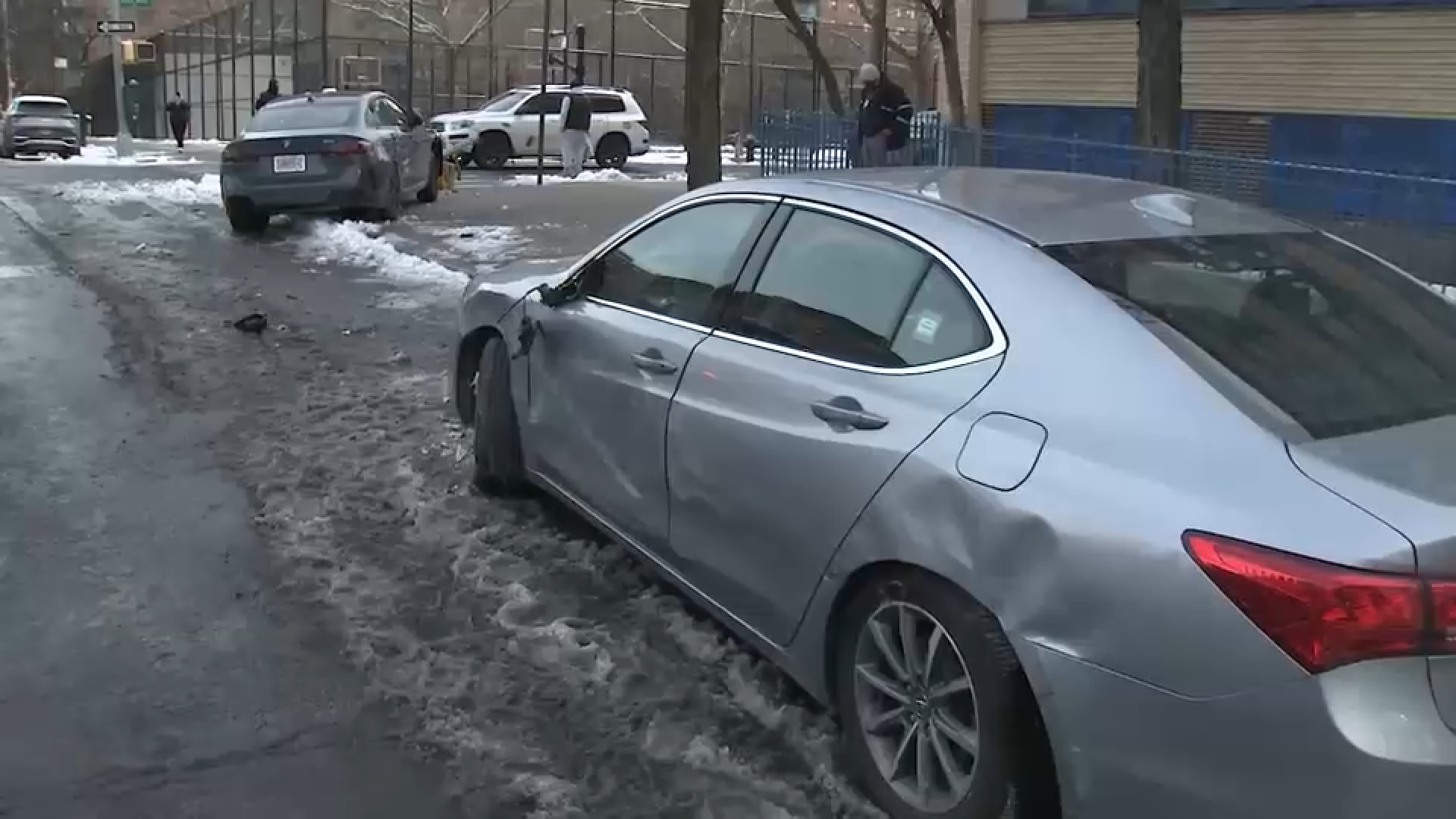 A few blocks down the road, an SUV was pushed up onto the sidewalk. Meanwhile, the back of a blue coupe was obliterated.
