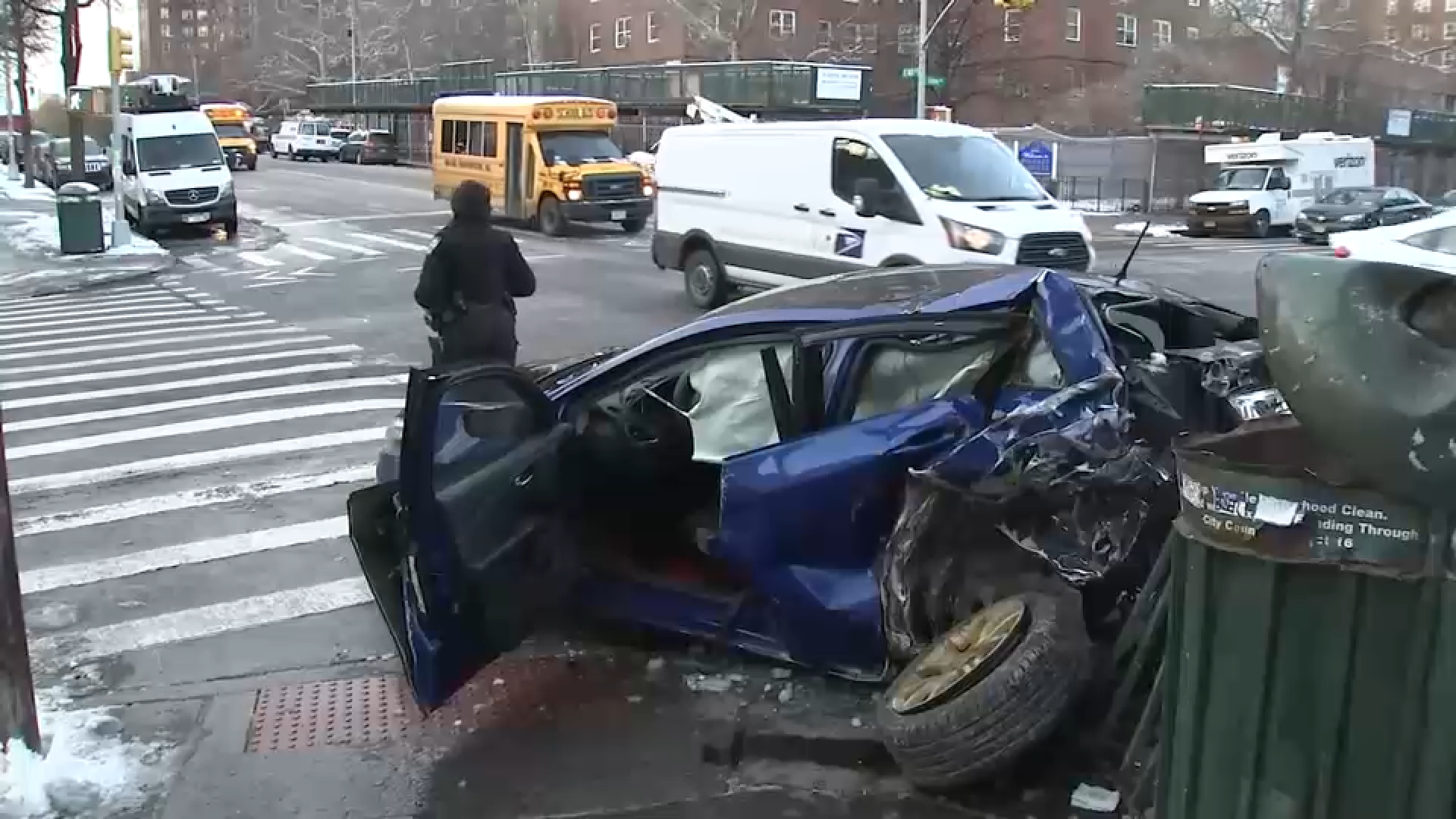 Two vehicles were struck by the out-of-control bus in front of a school on East 163rd Street and Caldwell Avenue: a grey sedan that was shoved into a light pole and another parked car that was hit on its side.