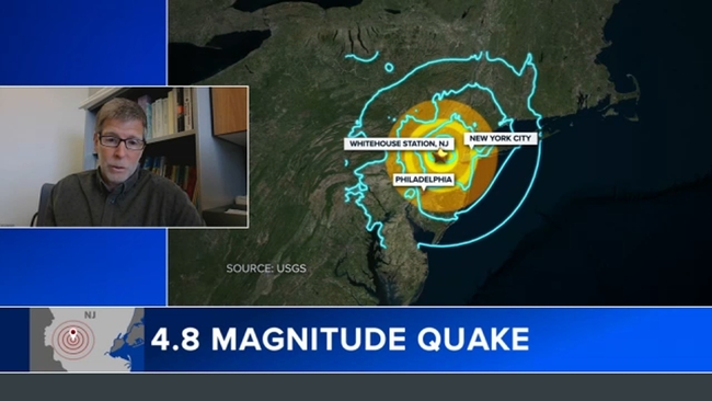 The U.S. Geological Survey reported a quake at 10:23 a.m. with a preliminary magnitude of 4.8, centered near Whitehouse Station, New Jersey, or about 45 miles west of New York City and 50 miles north of Philadelphia. The agency's figures indicated that over 42 million people might have felt the rumbling.
