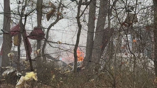 Firefighters poured water onto the gutted structure for hours as flames continued to burn. Officials said a neighboring building was also damaged, but the situation is now under control.