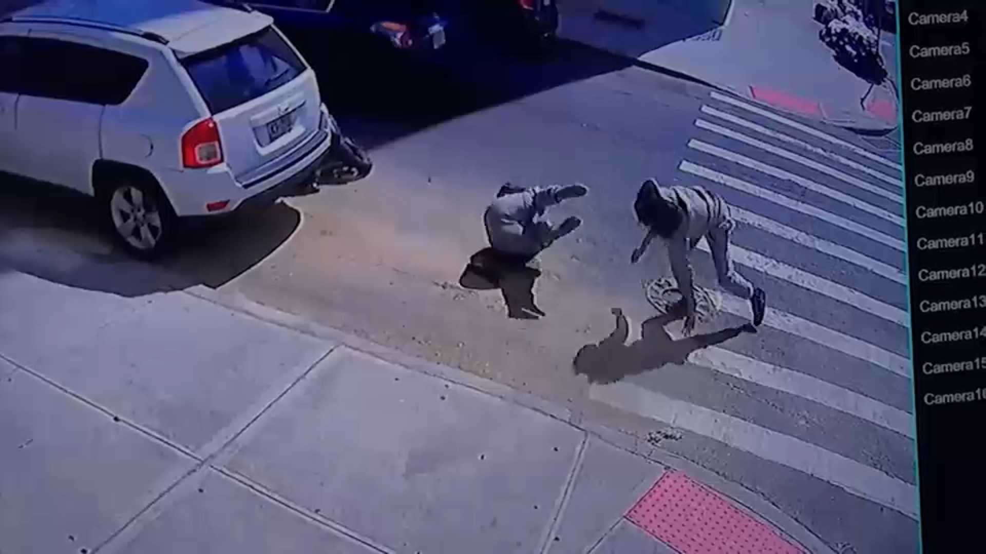 Police say video shows the moped continuing northbound, heading the wrong way on Humboldt Street. The footage then shows the scooter crash into an oncoming car at Manhattan Avenue and Siegel Street, two blocks from the scene, and both men are thrown from the scooter. The rear passenger, the alleged gunman, landed so hard on the pavement that he lost both of his shoes, which were later recovered by police.